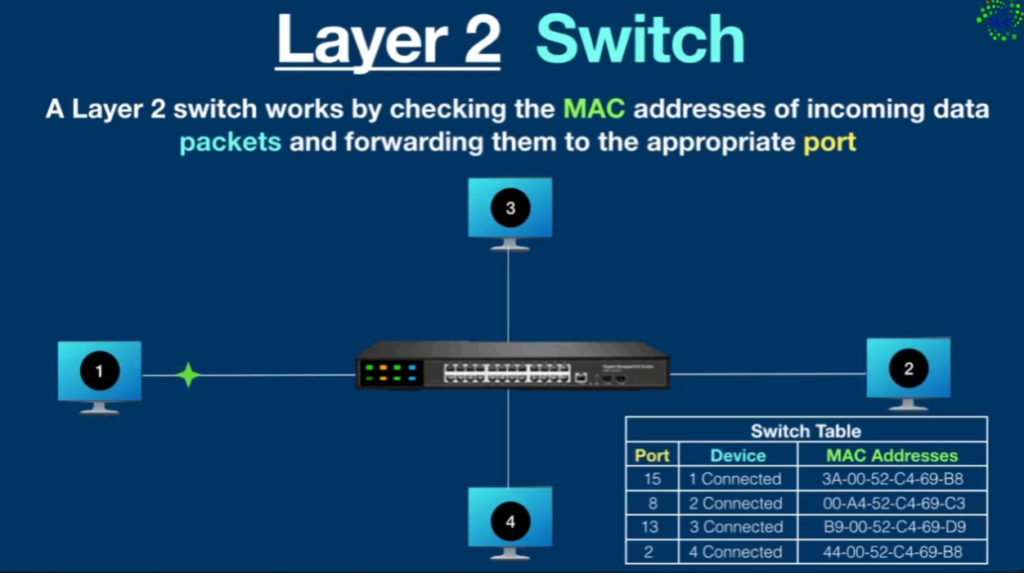 - MAC Address Table: A Layer-2 switch will keep a MAC address table that identifies the MAC address of the connected device and the port number. This enables the switch to direct frames towards the correct destination.