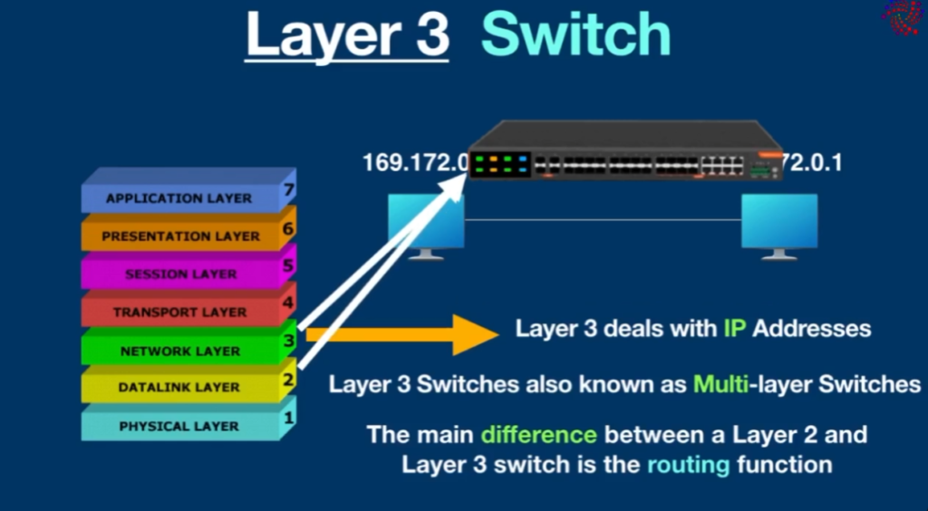 - Layer-3 switch: Uses IP address and performs routing.