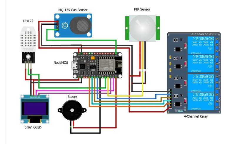 We will need a DHT22 Temperature and Humidity sensor to measure room humidity and temperature. MQ-135 Gas sensor to measure the gas leakage in the kitchen. A PIR sensor to detect the presence or absence of humans in the kitchen. We are using a simple 5V buzzer for alarm when the gas level exceeds. Similarly, 0.96″ I2C OLED Display for displaying Room temperature, humidity & Air Quality Index. We also have 4 channel relay modules to control the home appliances like lights, fridge, oven, heater, etc. Whereas relay 4 is connected to an exhaust fan which turns ON and OFF according to the gas level threshold value. The heart and brain of this project is a NodeMCU ESP8266 Board. But, you can use any of the ESP8266-12E based boards.
