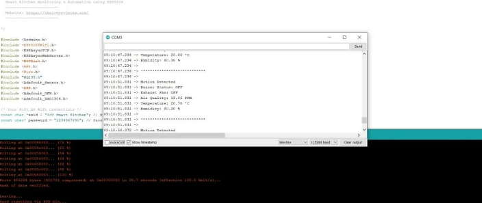 Meanwhile, you can open the Serial Monitor as well. The Serial Monitor will display the Humidity, Temperature, Air Quality Index, Alarm Status, Human Detection, etc.