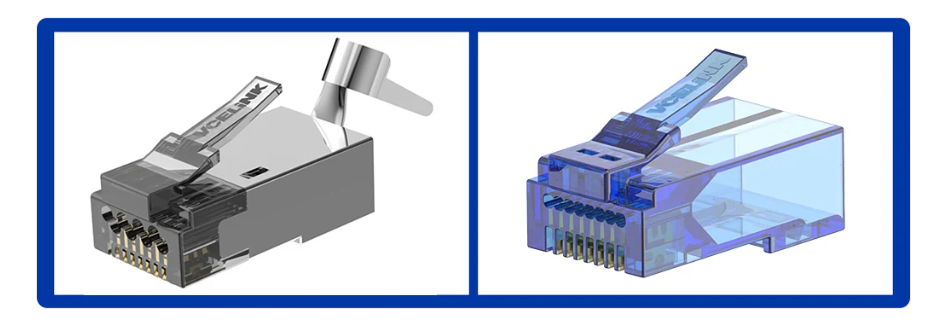 Standard RJ45 connectors can also be named as non-pass-through RJ45 connectors, which are usually referred to as 8P8C modular plugs. Pass-through RJ45 connectors allow the network cable wires to pass out of the connector body. Compared to standard RJ45 connectors, pass-through RJ45 connectors are easy to keep Ethernet cable wires aligned before terminating the connectors. In addition, pass-through RJ45 connectors are easier to operate, ideal for novices or DIYers. Pass-through RJ45 connectors usually require a specific crimping tool.