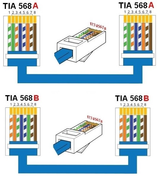 - Straight Cable: Same color code on both ends (A-A or B-B)