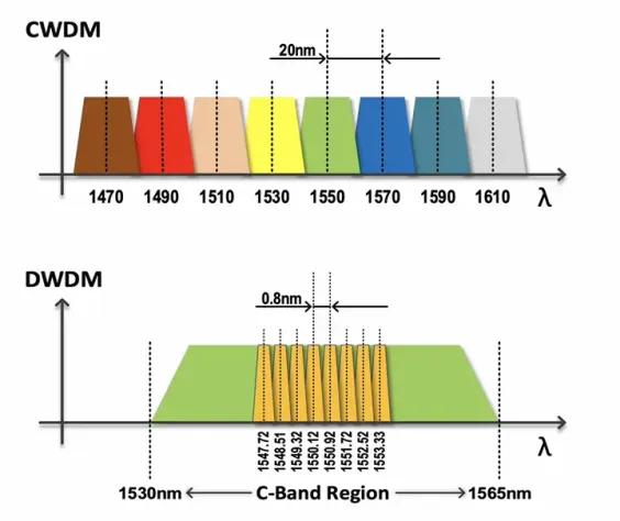 The distance and reach abilities of WDM technologies are closely aligned with wavelength spacing. The wavelength spacing of DWDM is slightly tighter than that of DWDM, significantly increasing capacity. Therefore, DWDM is more expensive and complex than CWDM, and it is most suitable for high-traffic long-distance communication networks (exceeding 100 km).
