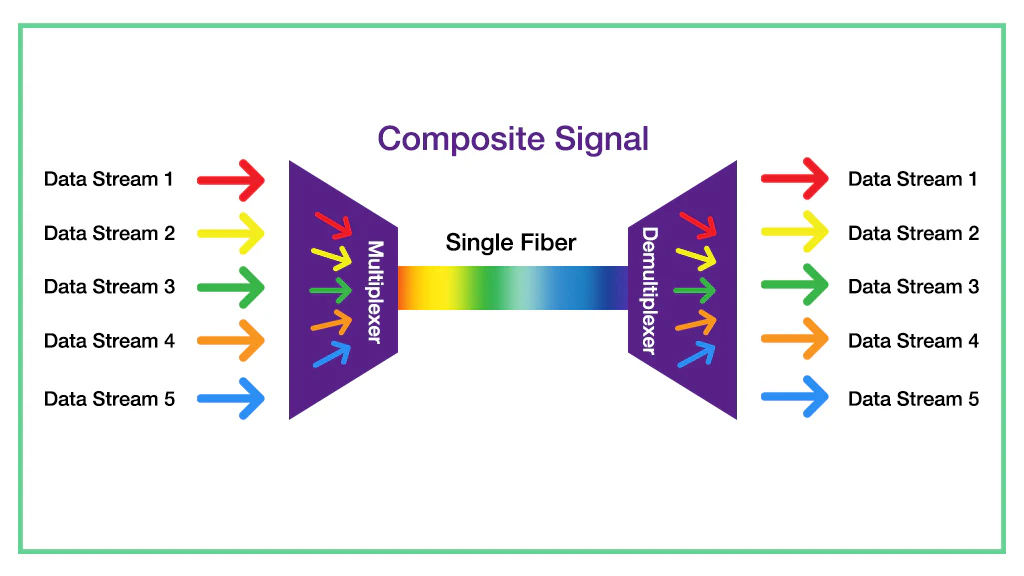 FWDM uses specialized filters that mix or divide light signals according to their wavelengths. This capability allows several data transfers at separate wavelengths without interference. Everything happens via a single optical fiber at the same time.