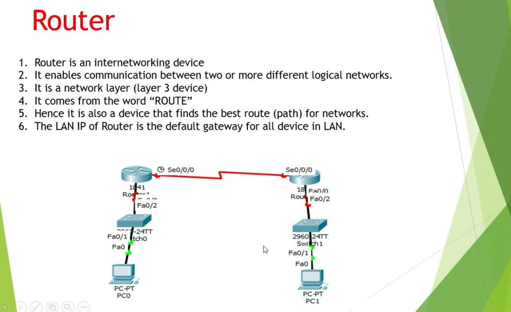 A Router is a networking device used to connect multiple networks and forward data packets between them. It works mainly at Layer 3 (Network Layer) of the OSI Model. The main function of a router is to examine the IP address of incoming data packets and decide the best path to send them to the correct destination network. Routers maintain a routing table that stores information about different network paths, and they use routing protocols such as OSPF, RIP, and BGP to exchange routing information with other routers. In a company network, routers are used to connect LANs (Local Area Networks) to other LANs or to the internet. For example, a router connects an office network to an ISP so employees can access websites and cloud services. Routers can also provide additional features such as NAT (Network Address Translation), DHCP services, traffic filtering, and basic firewall security. By controlling how data travels between networks, routers help ensure efficient communication, improve network performance, and increase security in small, medium, and large enterprise environments.