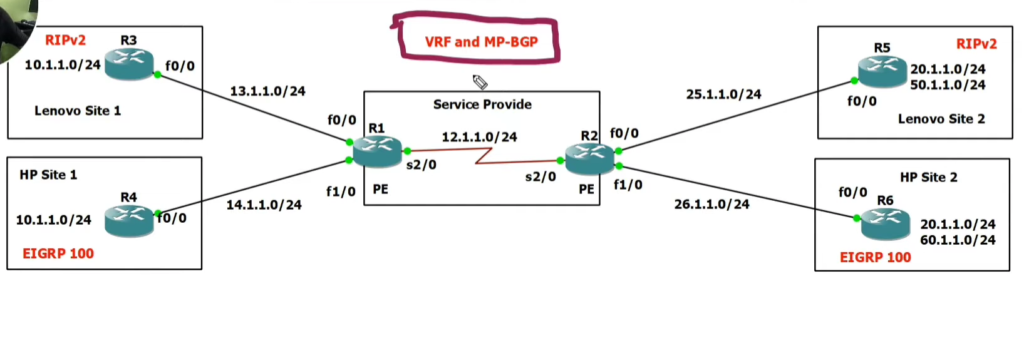 We will use BGP between the PE routers so that they can share information from the VRFs. Here’s how it works: