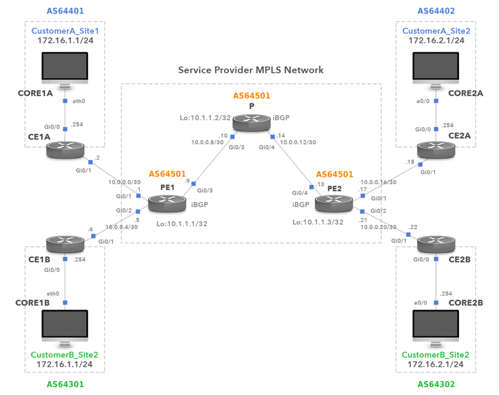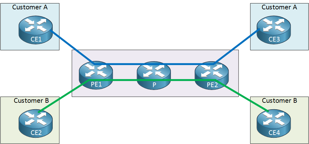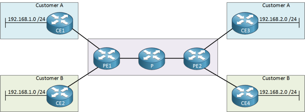 Above we have two customers connected to a service provider network. Customer A and B each have two sites and you can see that they are using the same IP ranges.