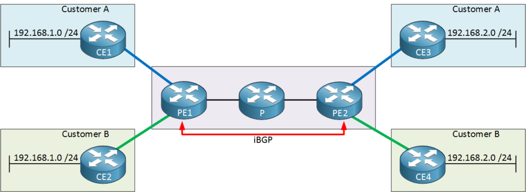 There’s a couple of problems though. First of all, our two customers are using overlapping address space. Let’s say that our PE1 router is advertising 192.168.1.0 /24 from customer A to the PE2 router on the other side. Here’s what happens: