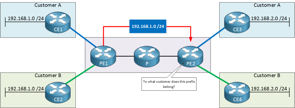 The PE2 router will learn 192.168.1.0 /24 from the PE1 router but it has no clue to what customer it will belong. There is no way to differentiate if something belongs to customer A or B.