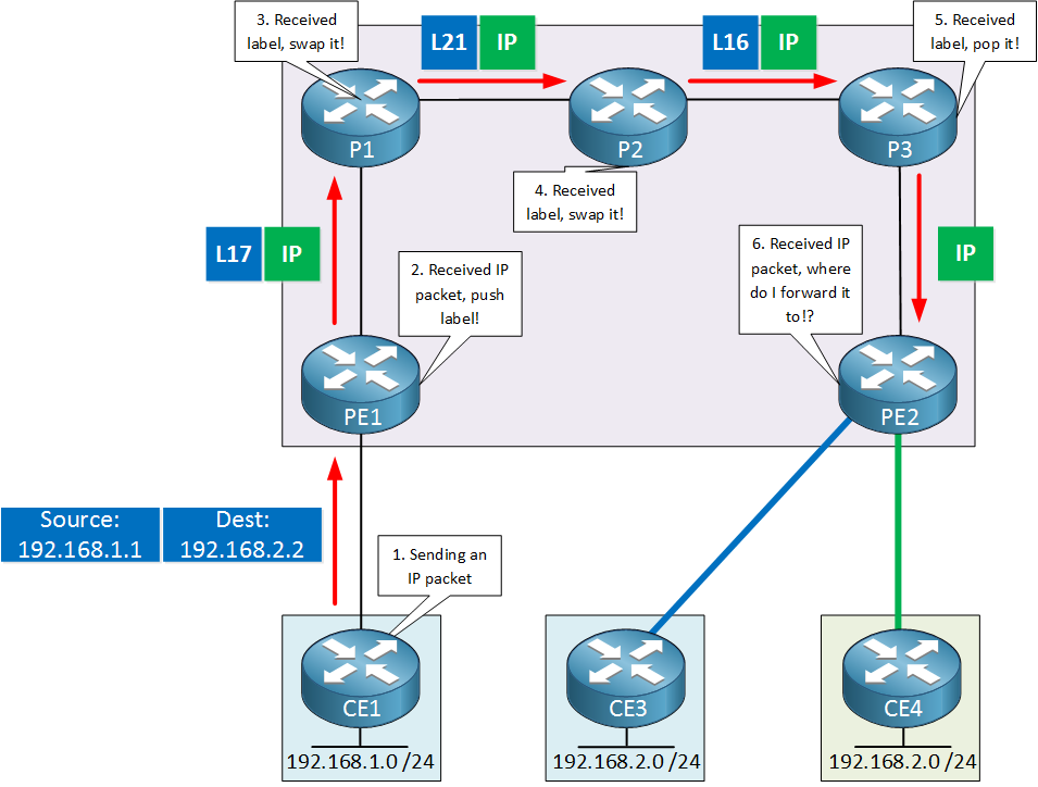Everything that we just discussed about the VRFs, MP-BGP, RD and RT occurs on the control plane. On the data plane, we still have a problem. Let me give you an example:
