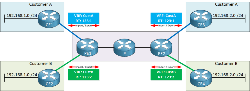 In the picture above you can see that the PE routers are importing and exporting everything from customer A with RT value 123:1. This allows CE1 and CE3 to learn everything from each other. We do the same thing for customer B but we use RT 123:2 for VRF CustB.