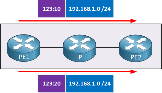 • When PE1 receives a prefix from CE1, it will add RD 123:10 to it to create a unique VPNv4 route.