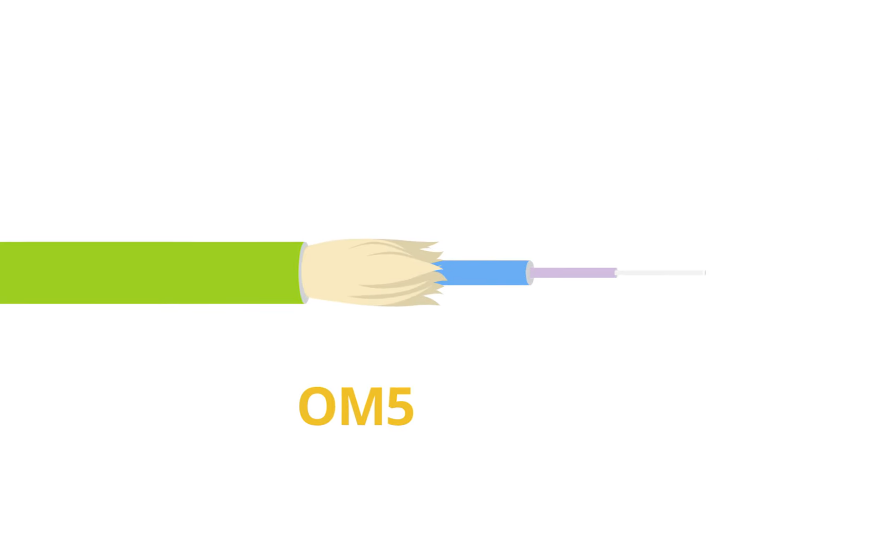 OM5 fiber, also known as WBMMF (wideband multimode fiber), is the newest type of multimode fiber, and it is backwards compatible with OM4. It has the same core size as OM2, OM3, and OM4. The color of OM5 fiber jacket was chosen as lime green. It is designed and specified to support at least four WDM channels at a minimum speed of 28Gbps per channel through the 850-953 nm window. More details can be found at: Three Critical Focuses on OM5 Fiber Optic Cable