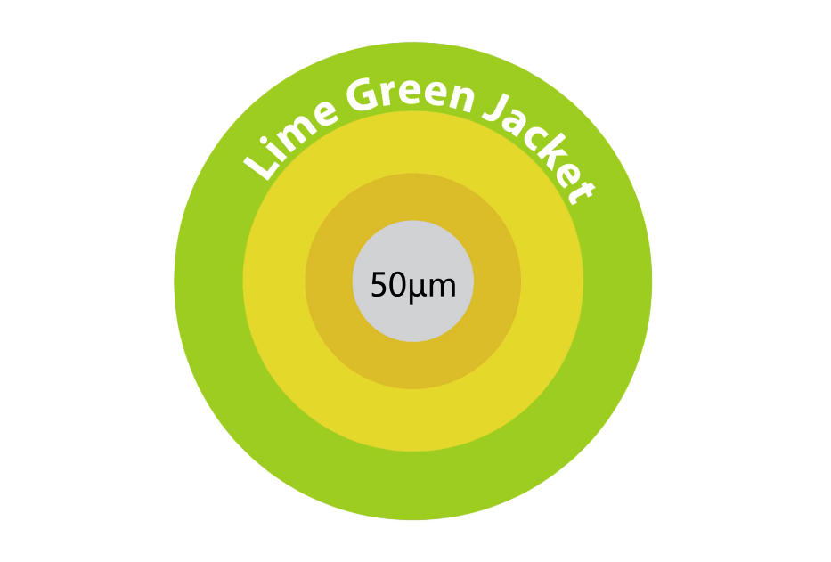 OM1 and OM2 cables have an orange jacket, OM3 and OM4 use aqua, and OM5 fiber is lime green.