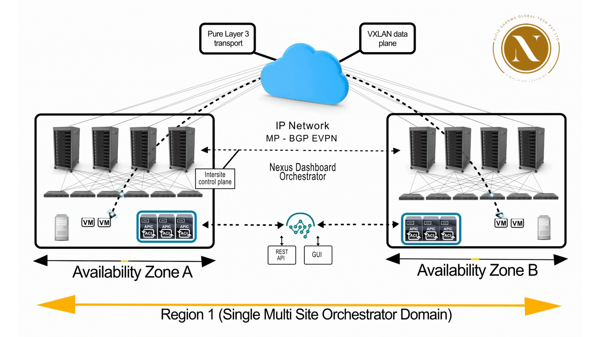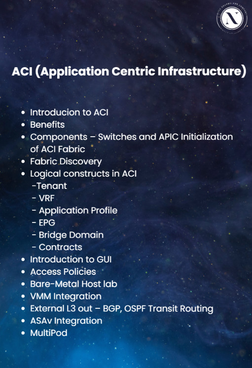 The Cisco Data Center course covers data center architecture, Nexus switching, UCS servers, storage networking, VXLAN overlays, ACI SDN, virtualization, security, automation, monitoring, and cloud integration—all required skills to become a Data Center Network Engineer.