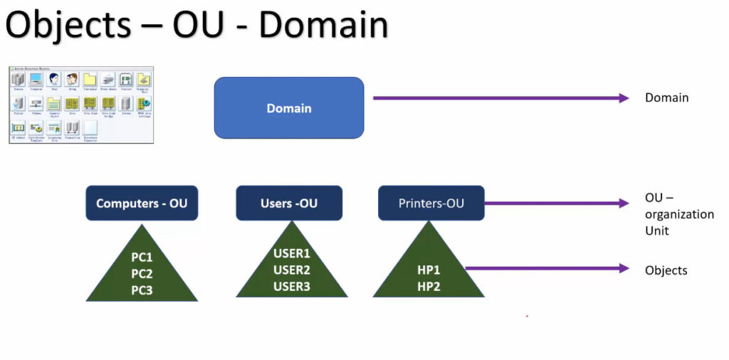 Organization → Keeps all network resources organized (users, PCs, printers, servers)