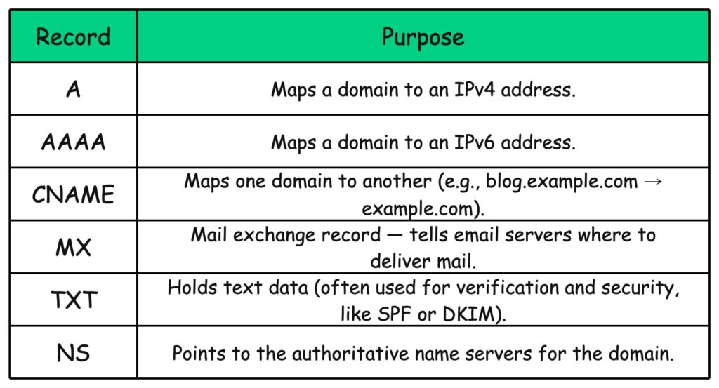 In the Domain Name System (DNS), DNS records are database entries that store information about a domain name and tell DNS servers how to handle requests for that domain. Each record type has a specific fu