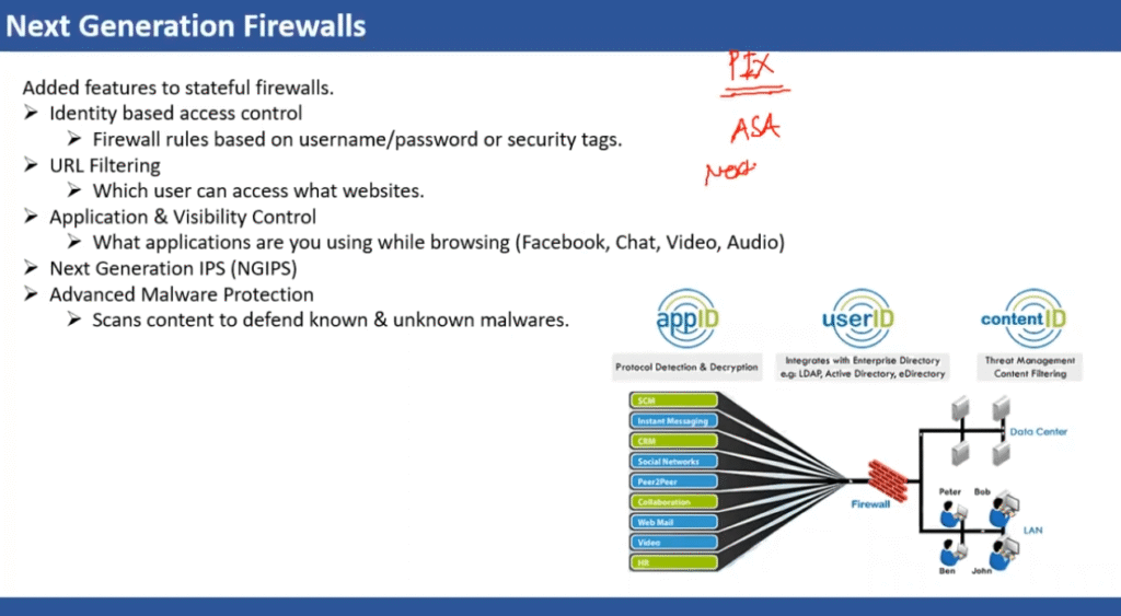 Next generation firewalls have more sophisticated features than a traditional, or legacy, network firewall. Here are some common next generation firewall features: