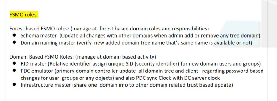 The FSMO (Flexible Single Master Operation) roles are a set of special roles in a Microsoft Active Directory (AD) environment that are critical for the proper functioning of the AD infrastructure. These roles are responsible for specific operations and ensure that the domain controller (DC) acts efficiently and consistently across the network.