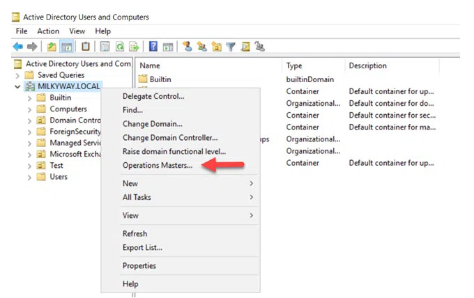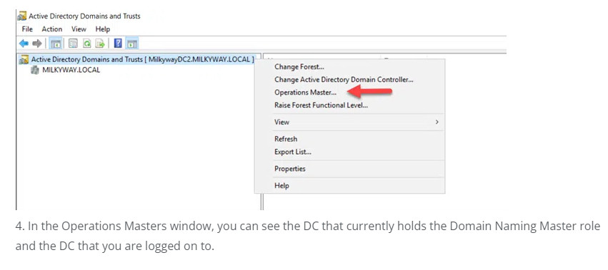 Right-click on the Active Directory Domains and Trusts node and choose Operations Masters