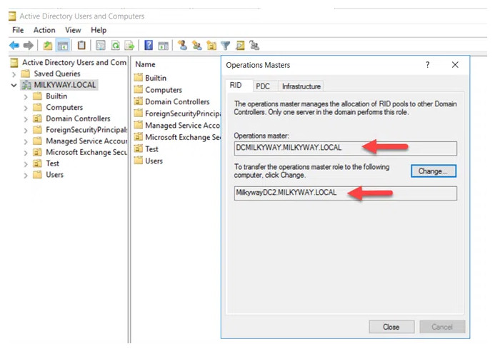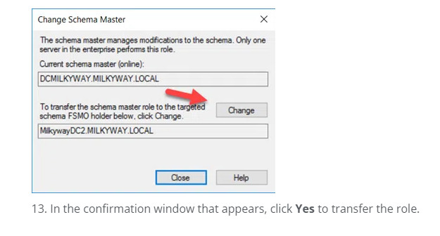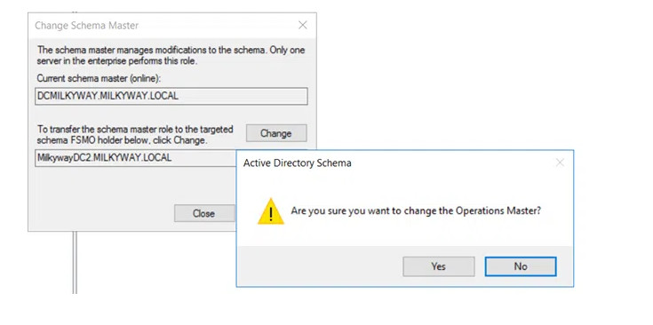 To transfer the role from the current DC to the target DC, click the Change button. When asked to confirm the action, click Yes.