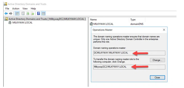 4.Type the command below, replacing milkywayDC2.milkyway.local with the name of the DC you want to transfer the roles to, and press Enter.