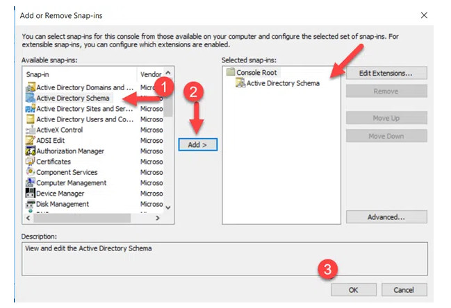 2. Click Active Directory Schema in Available snap-ins and then click the Add button. On the right, you will see that Active Directory Schema is now listed. Click OK to close the window.