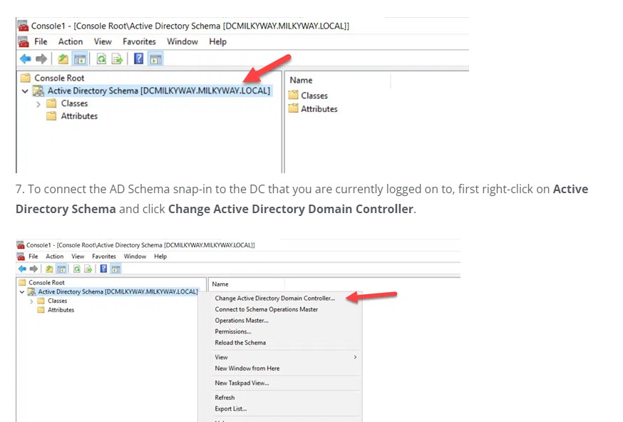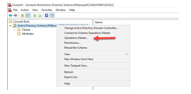 3.The Active Directory Schema snap-in is not connected to the DC that currently holds the Schema Master role — but that isn’t the DC we want to transfer the role to.
