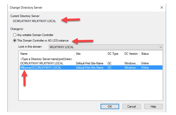 4. Select the This Domain Controller or AD LDS instance radio button and choose the correct DC. Click OK to close the window.