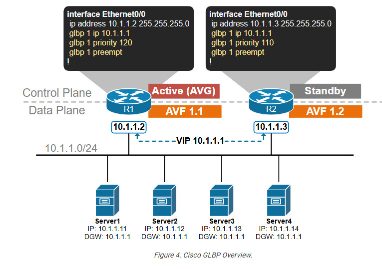 Gateway Load Balancing Protocol (GLBP) is one of First Hop Redundancy Protocol (FHRP) which provides redundancy like other First Hop Redundancy Protocol, also provides load Balancing. It is a Cisco proprietary protocol which can perform both functions. It provides load Balancing over multiple routers using single virtual IP address and multiple virtual Mac address. GLBP terms :
