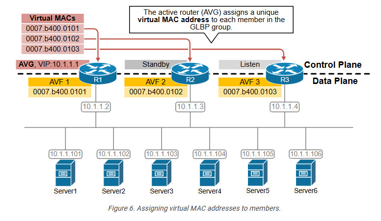 The Actual Virtual Gateway (AVG) provides virtual Mac addresses to all the other routers operating GLBP of the same group. The remaining routers are Actual Virtual Forwarder (AVF). When an ARP request comes from subnet device to know the Mac address of the virtual IP address, one of the virtual Mac addresses is provided by the AVG. AVG will provide the virtual Mac address by using Round Robin algorithm or other algorithms that have been applied. In this way, all devices running GLBP are used to forward traffic. GLBP virtual Mac address Assignment : When a subnet device (host) wants to send traffic, it requests a Mac address for the virtual IP (gateway) by sending an ARP request. In response to the ARP request, AVG will provide one of the virtual Mac address (provided to AVF by AVG). Virtual Gateway Redundancy : To detect a gateway failure, GLBP members communicate with each other through hello messages, sent in every 3-seconds to the multicast address
