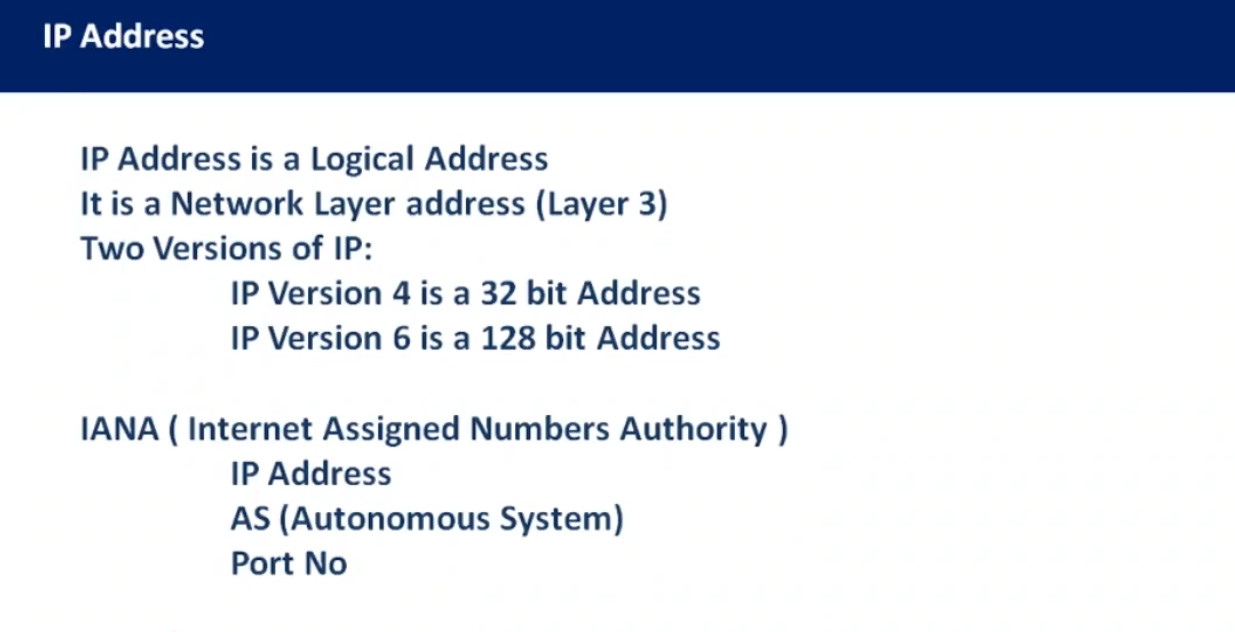 An IP address (Internet Protocol Address) is a unique numerical identifier assigned to every device connected to a network that uses the Internet Protocol (IP). It works like a home address for devices so that data packets can be sent from a source device to a destination device across networks. Without IP addressing, routers and computers would not know where to send or receive dat on the Internet.