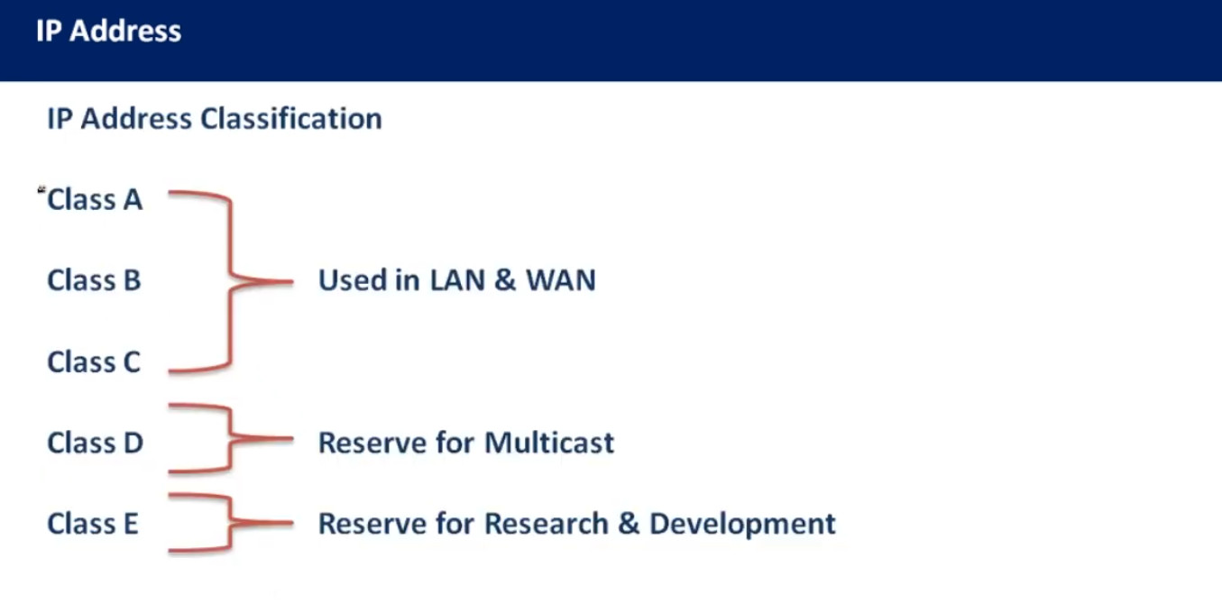 IPv4 addresses are categorized into different classes based on their range, and each class serves different purposes (e.g., public, private, reserved). There are 5 main classes of IPv4 addresses: A, B, C, D, E.