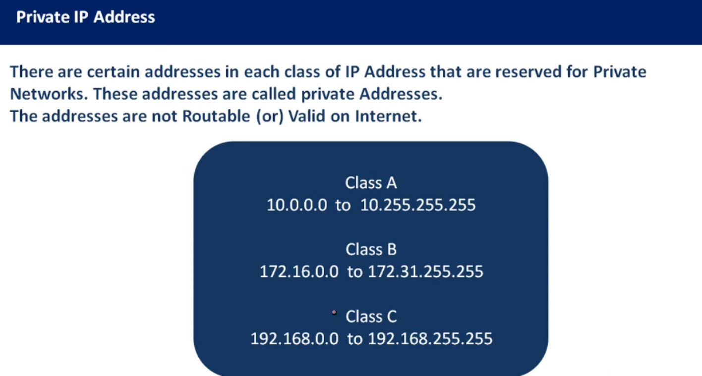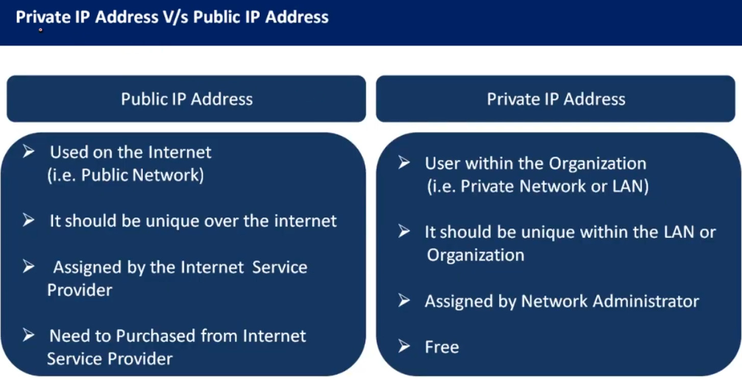 | Private IP | 10.x.x.x / 172.16–31.x.x / 192.168.x.x | Used inside local networks |