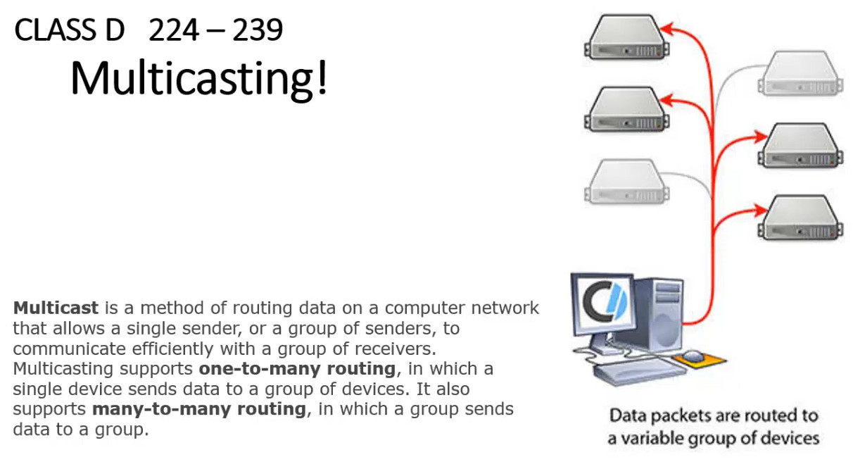 224.0.0.0to239.255.255.255 - Purpose: Class D addresses are used for multicasting, where data is sent to multiple receivers at once, not individual devices.