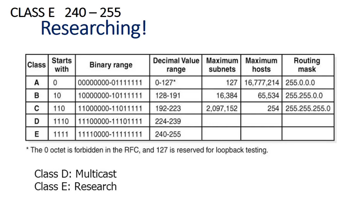 240.0.0.0to255.255.255.255 - Purpose: Class E addresses are reserved for experimental or future use. They are not used in public or private networking.