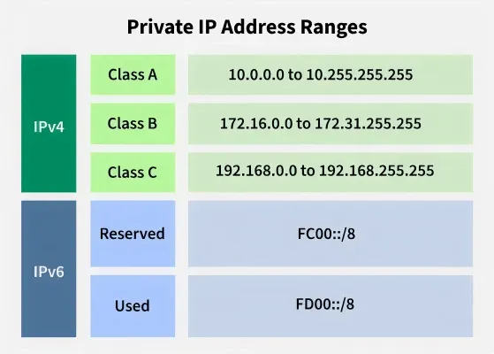 - Defined ranges for IPv4: 10.0.0.0 to 10.255.255.255, 172.16.0.0 to 172.31.255.255, 192.168.0.0 to 192.168.255.255