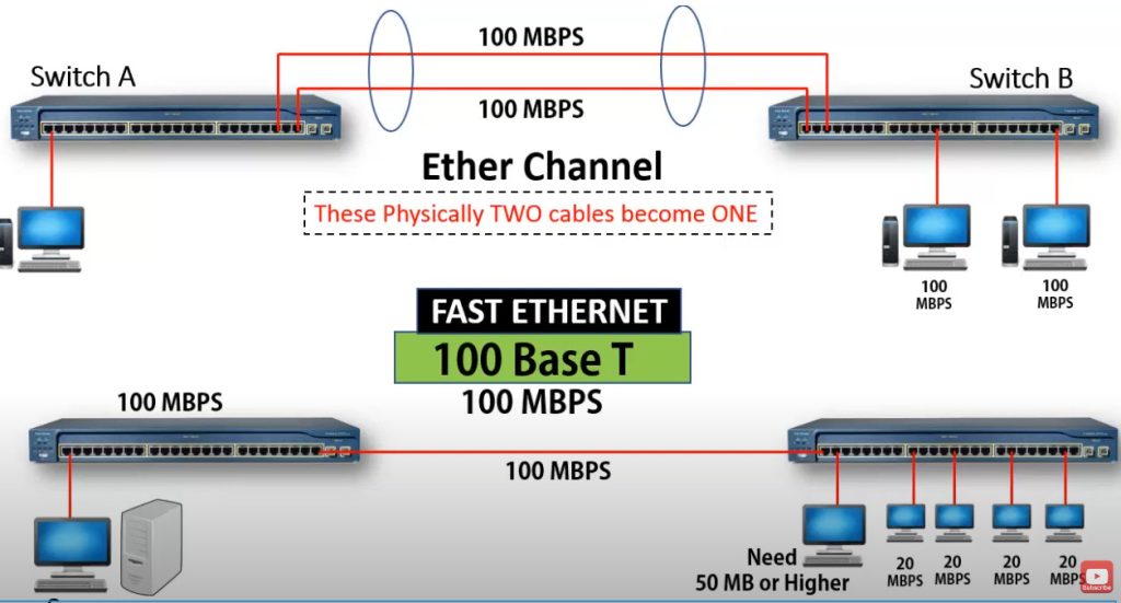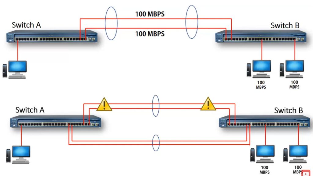 Imagine a company has two switches (Switch A and Switch B) connected with only one 1-Gbps cable. Many users access servers through this link, so the connection becomes slow during busy hours. Also, if this single cable fails, the entire network connection between the switches goes down.