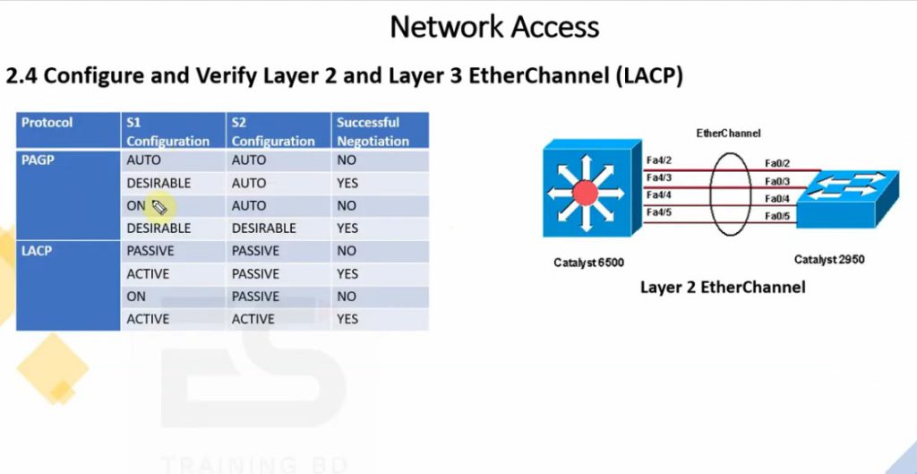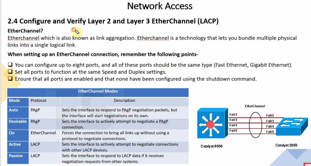 There are different methods to form EtherChannel. The most common are LACP (Link Aggregation Control Protocol), which is an open IEEE standard, and PAgP (Port Aggregation Protocol), which is Cisco-proprietary. There is also a manual mode called “on”, where links are forced into a channel without negotiation. All ports in an EtherChannel must have the same configuration (speed, duplex, VLAN settings, and trunk/access mode) to work properly.