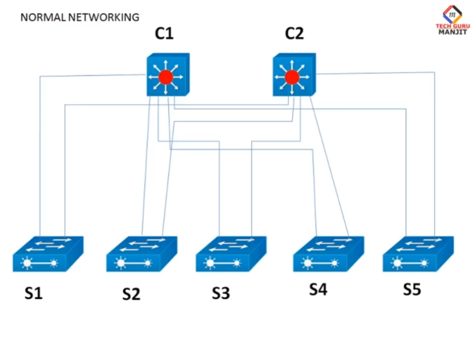 In virtual stacking, switches are connected using normal Ethernet or fiber ports instead of special stacking cables. They still appear as one logical switch for management, but performance is usually lower than physical stacking. Control plane is shared logically, and the switches synchronize configurations over network links.