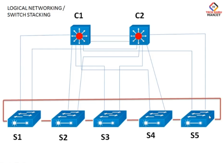 In a medium-sized company office, there are about 150 employees who use computers, IP phones, printers, and Wi-Fi access points. The IT department installs three 48-port managed switches in the server room. Instead of configuring and managing each switch separately, the switches are connected together using stacking cables and configured as a single switch stack. Now, all three physical switches behave like one logical switch with one management IP address and one configuration file.