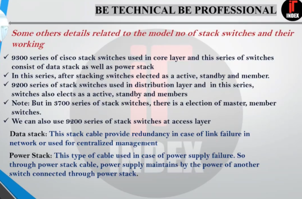 In switch stacking, the switches are connected using special stacking cables or dedicated stack ports that provide very high-speed communication between the devices. One switch in the stack is elected as the master (or primary) switch, which is responsible for managing the entire stack, handling configuration files, and controlling data forwarding decisions. The remaining switches act as member switches and follow the master’s instructions.